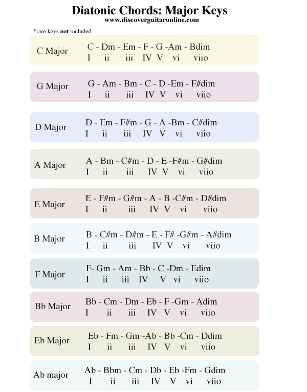 初心者にとって最も一般的なキーのひとつはCメジャーです。CメジャーのダイアトニックコードはC、Dm、Em、F、G、Amです。これだけで無数の曲を演奏できます。もうひとつ人気のキーはGメジャーで、G、Am、Bm、C、D、Emが使えます。