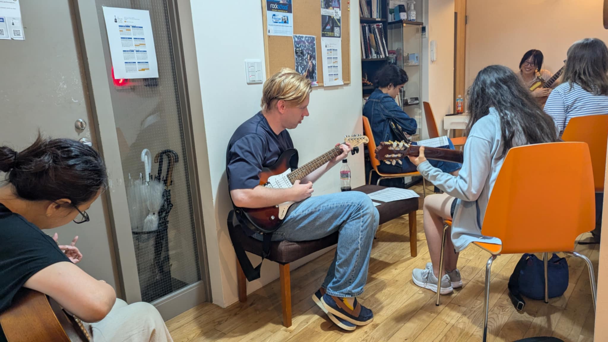 一部の生徒はエレキギターを持参しましたが、アメリカン・ギター・アカデミーにはクラシックスタイルのアコースティックギターが揃っており、ヒデが好む環境で全員が公平に参加できました。そのおかげでイベント全体にコミュニティ的な雰囲気が生まれました。