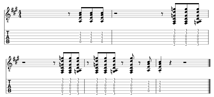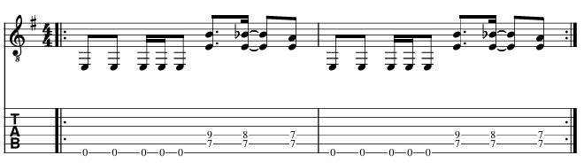 彼らの最も有名な曲であるこのリフは、最初の印象よりも少し難しいです。A弦7フレット上のパワーコードの5度がすぐに下降していきますので、私は小指→中指→人差し指のバレーという順で押さえるのが弾きやすいと感じます。自分に合った押さえ方を探してみてください!