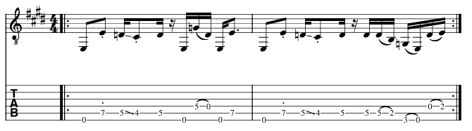 A弦上を素早く動くパートがありますが、全体としてはそこまで難しくありません。パームミュートを加えるとさらにカッコよくなりますよ。